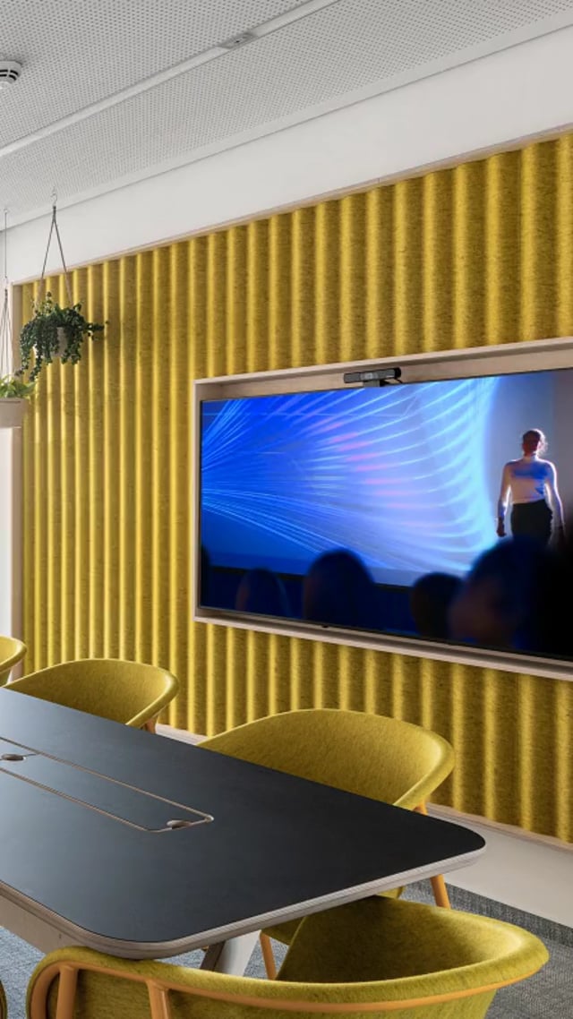 Sustainable and (digitally) connected – In the newly refurnished headquarter of METRO Markets GmbH a modern space for meetings and events has been created through the symbiosis of sustainable interior design (Sven Urselmann) and digital media architecture (visionate). Sustainability and aesthetics go hand in hand in the interior. For example, acoustic backs are made from recycled PET bottles. Thanks to new and flexible technologies, the space can be used for hybrid and purely local events and allows the combination of live and digital events. An optional booking system makes scheduling with participants a breeze.